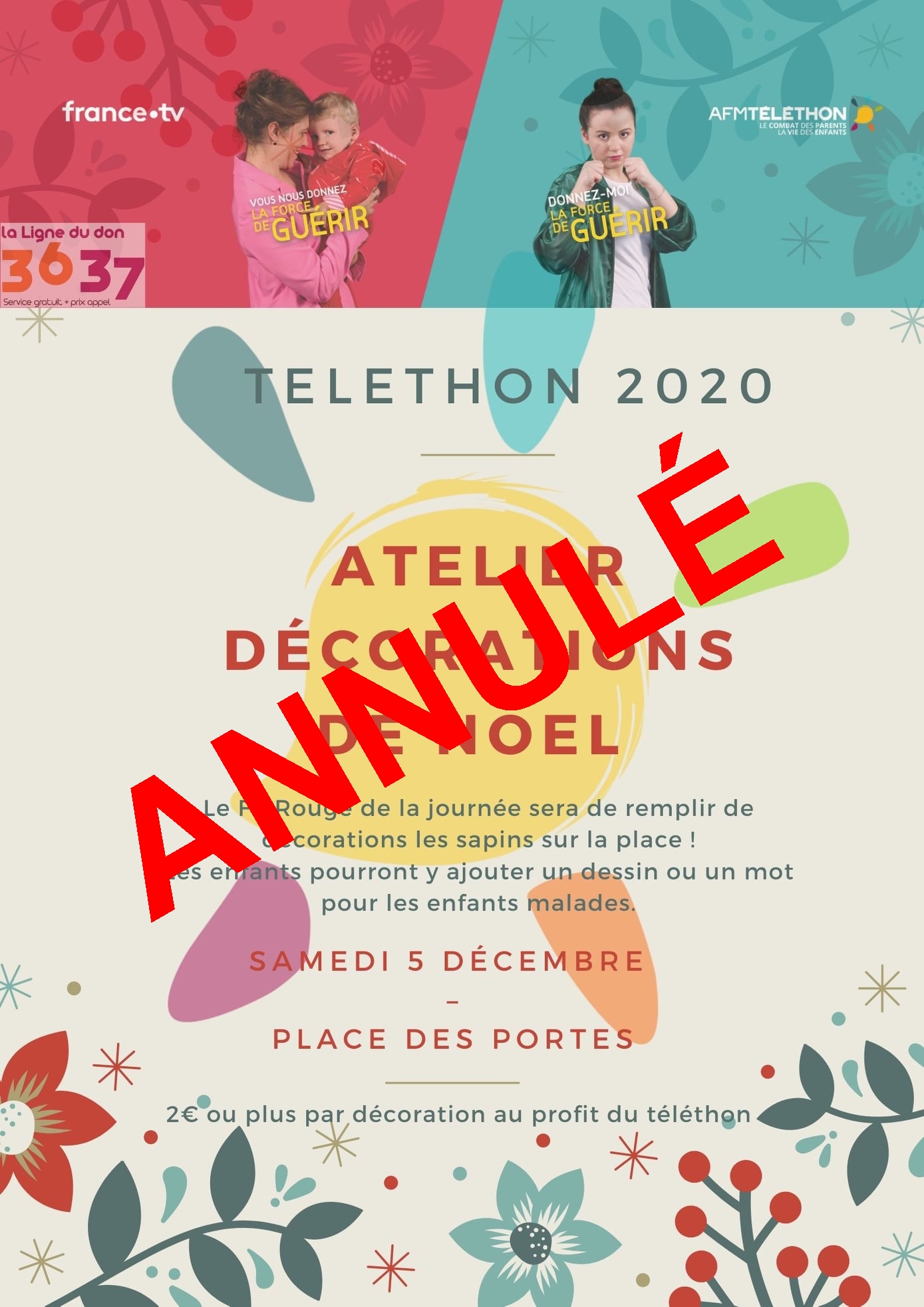 Malheureusement vu les conditions météorologiques actuelles, nous allons devoir annuler l’atelier décoration de Noël au profit du Téléthon.