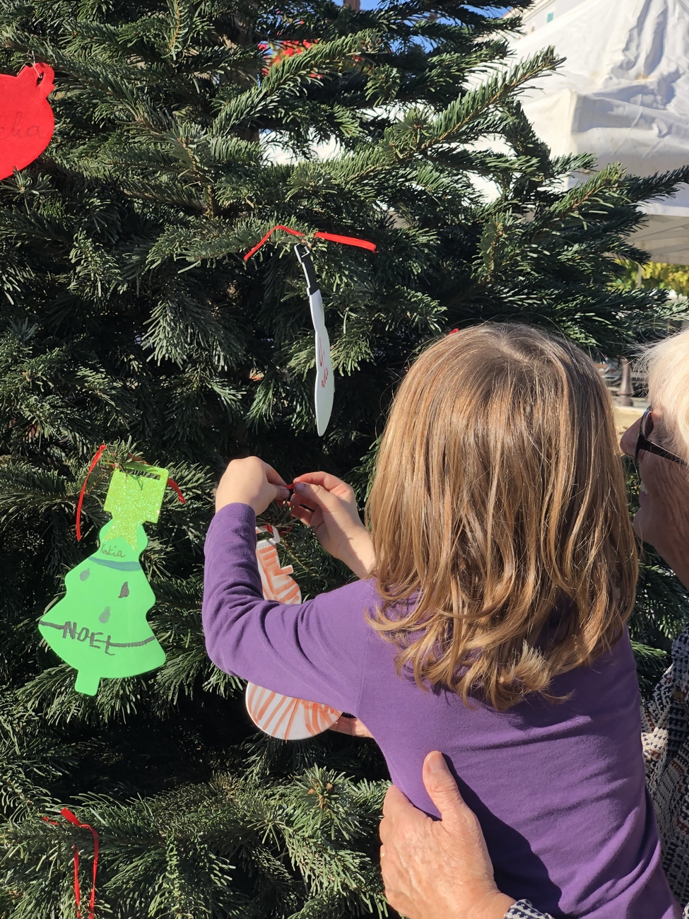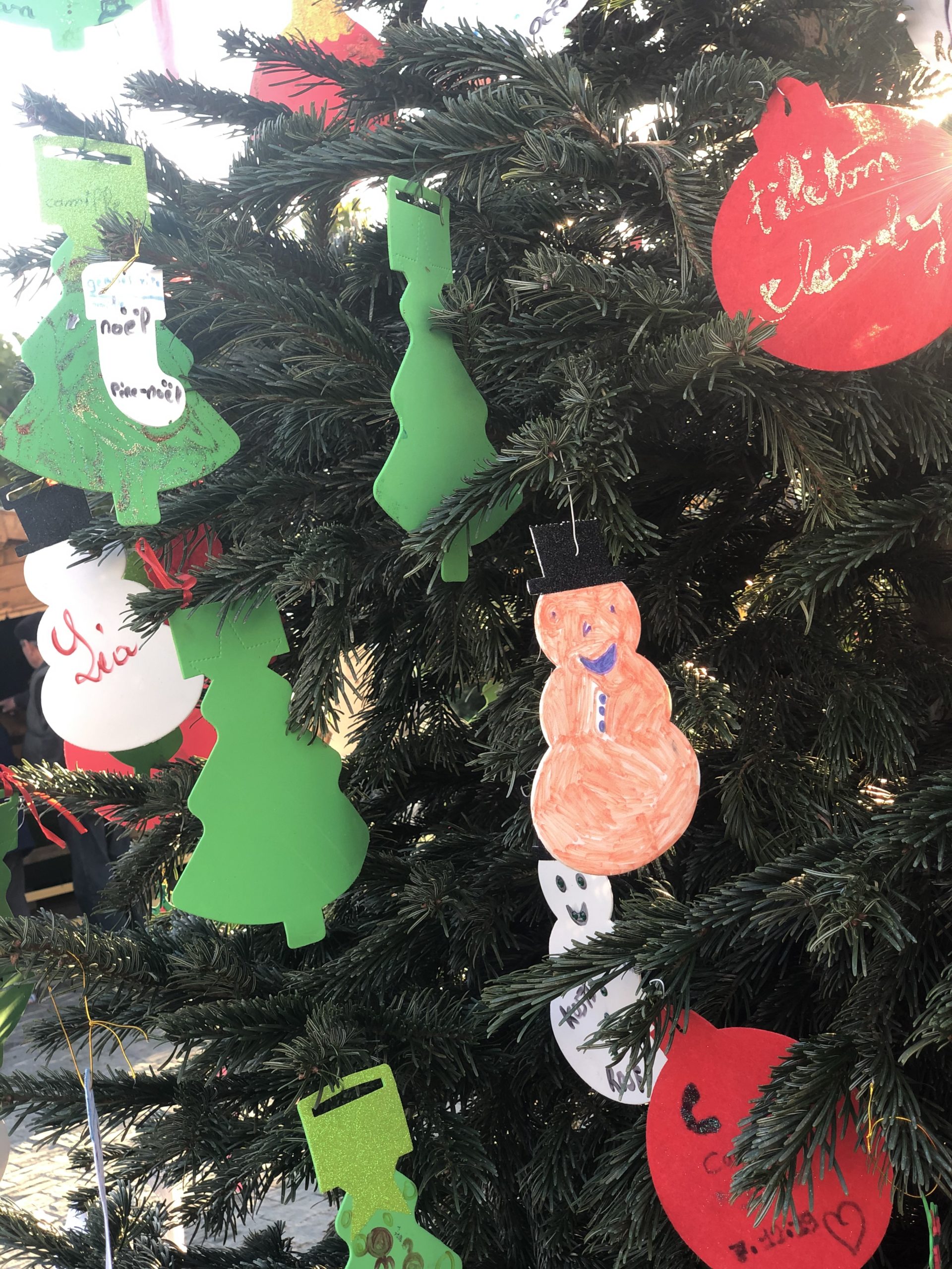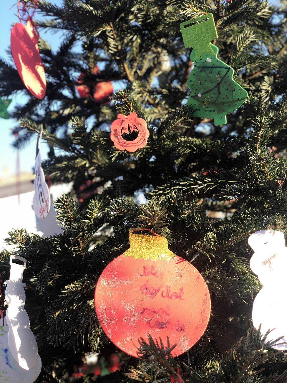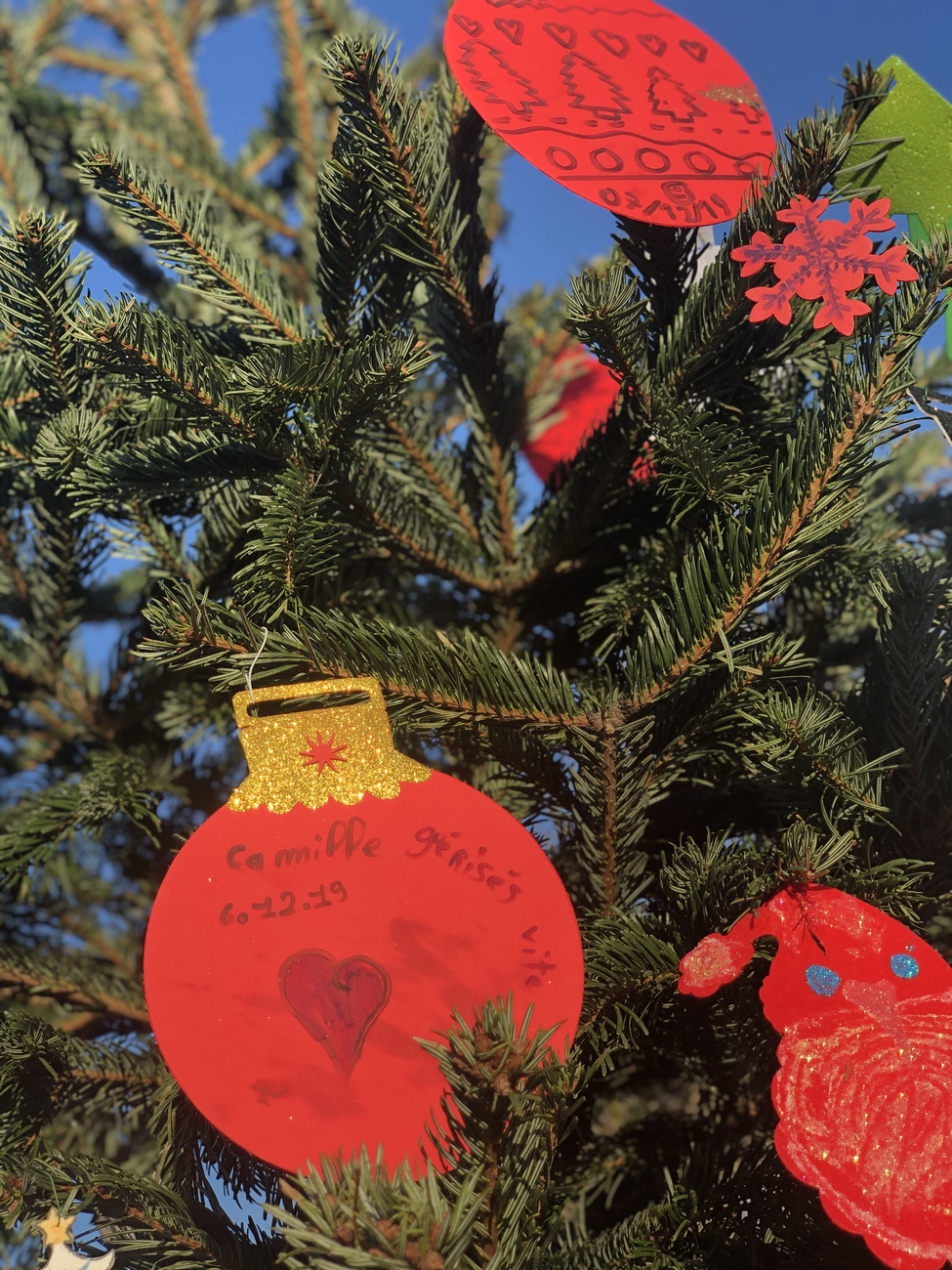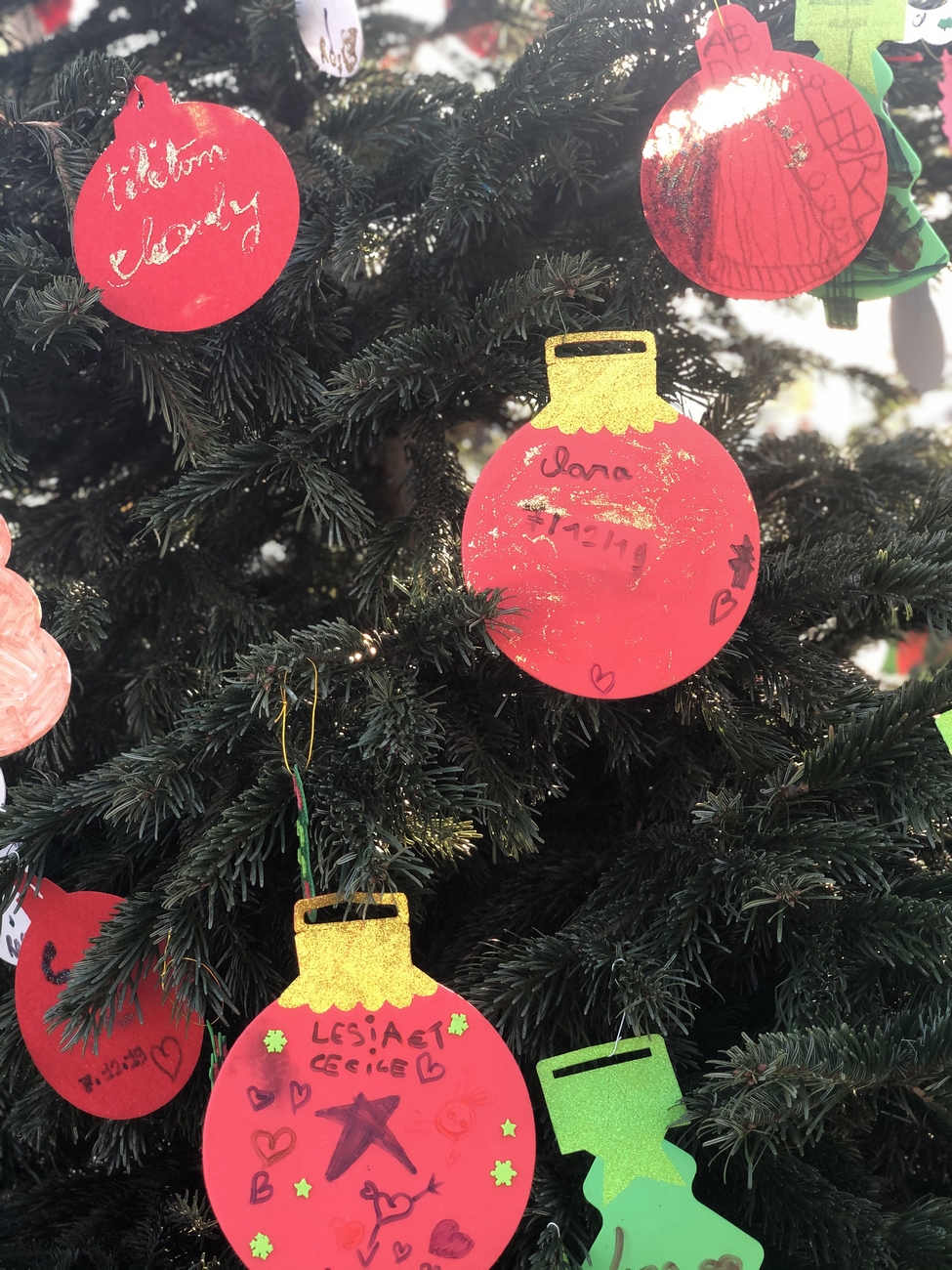 Le fil rouge de la journée : remplir le grand sapin de décoration de noël avec un mot ou un dessin pour les enfants malades, défi relevé haut la main grâce à la créativité des enfants et des plus grands !