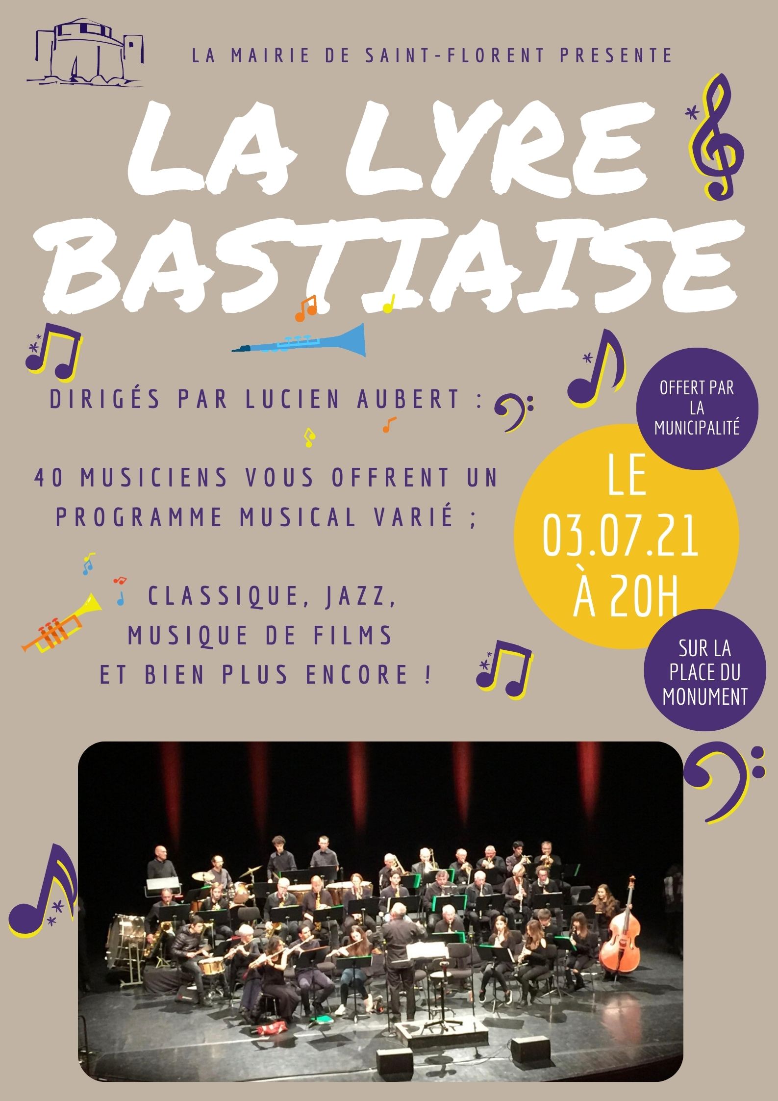 🎼🎤Samedi 3 Juillet à 20H, sur la place des Portes, nous vous invitons à venir écouter un concert offert par la municipalité de la « Lyre Bastiaise », 40 musiciens dirigés par Lucien Aubert !