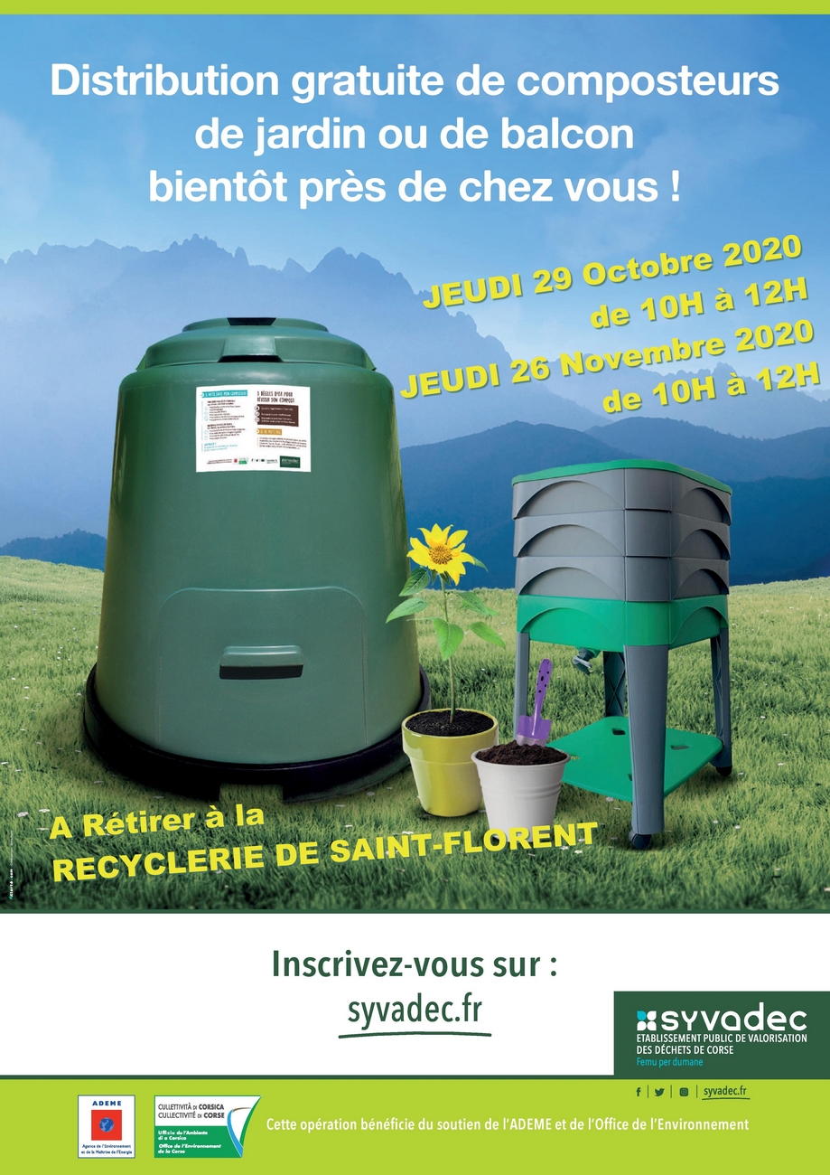 Les deux dernières distributions de composteurs et lombricomposteurs pour l’année 2020, par Le Syvadec auront lieu le Jeudi 29 Octobre, le Jeudi 5 Novembre et le Jeudi 26 Novembre 2020 à la Recyclerie de Saint-Florent.