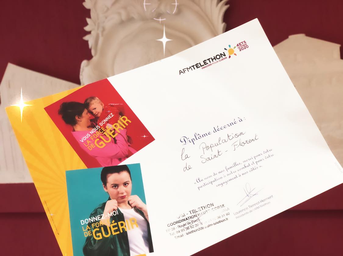 L’AFM-Téléthon nous a transmis un diplôme afin de remercier toute la population de Saint-Florent pour sa générosité, au nom des familles d’enfants malade.