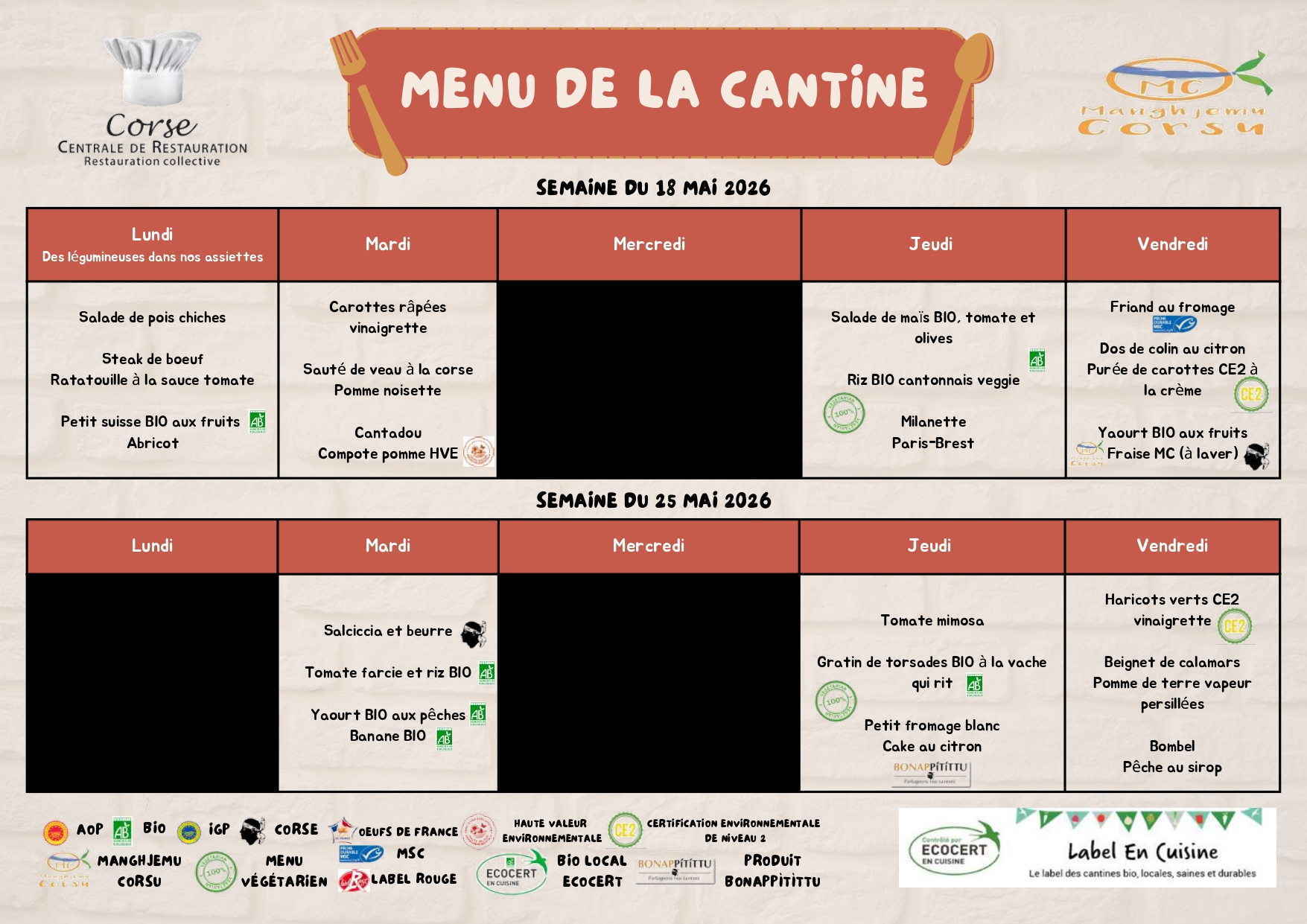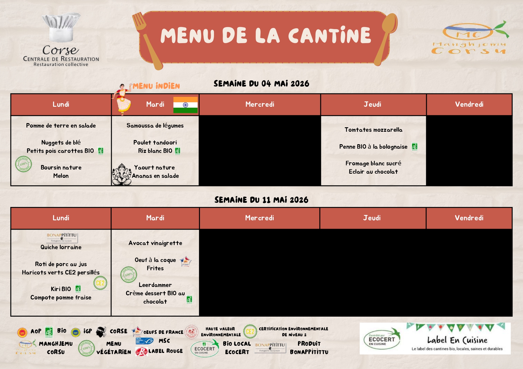 Retrouvez ici 👇👇 et sur la page de la cantine en cliquant ici, le menu de la cantine du Lundi 4 Mai au Vendredi 29 Mai 2026.