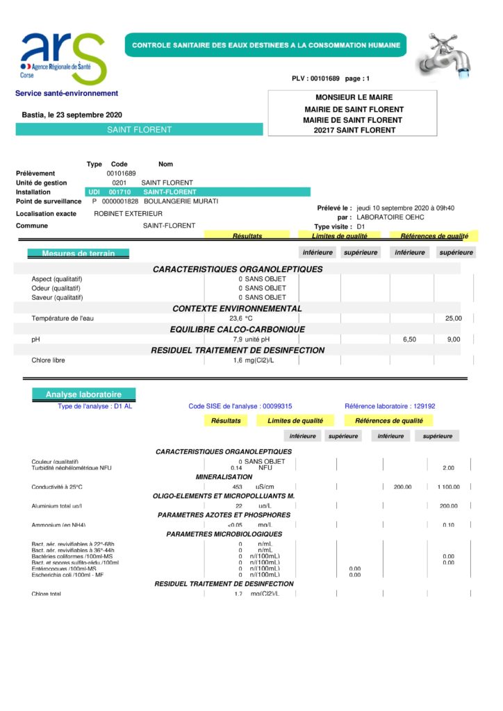 Retrouvez ci-dessous les résultats contrôle sanitaire des eaux destinées à la consommation humaine en date du 23 septembre 2020.